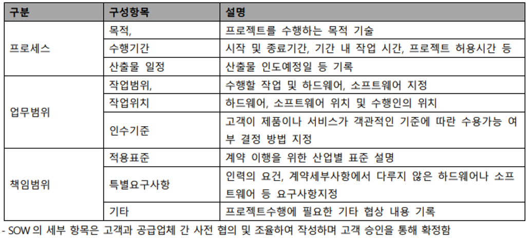 - 개발/구축 보다는 운영 및 유지보수 관련 SOW가 많이 쓰임