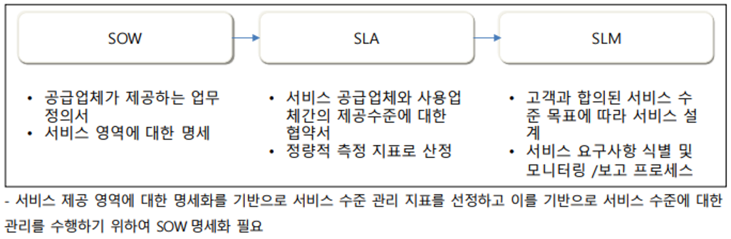 - 서비스 수준관리 위해 서비스 제공자와 사용자 간 합의된 협약서인 SLA의 세부적 범위 및 작업 내용 규정한 작업 명세서