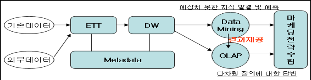 - 분석 대상 데이터를 수집하여 가공 후 DW에 적제 시켜 분석 도구를 통해 사용자에게 제공