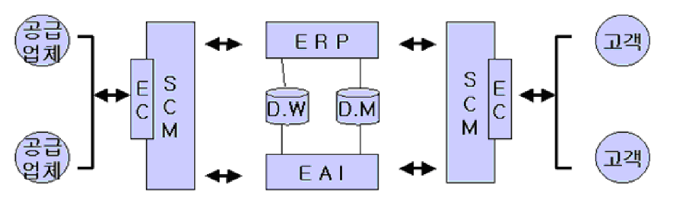 - CRM을 통한 고객 수요 정보를 수집하여 분석하고, ERP/DW/기업 내부 시스템을 EAI로 효율적인 연결, 공급 기업간 물류 및 현굼, 정보의 흐름을 조율
