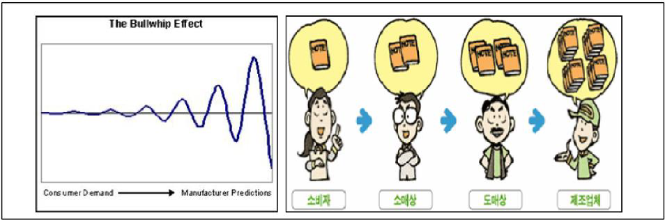 - 공급망에서 시장의 수요정보가 유통 단계를 거쳐 증폭/감소 하는 등의 왜곡이 발생하여, 과잉 또는 과소 생산이 발생하는 현상