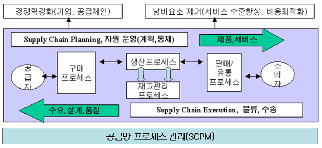 - 공급자에서 최종 소비자에 이르는 제품의 공급체인 관련 모든 과정을 효율적으로 통합하여, 기업의 수익증가와 고객 서비스 개선을 위한 정보화된 혁신 경영기법